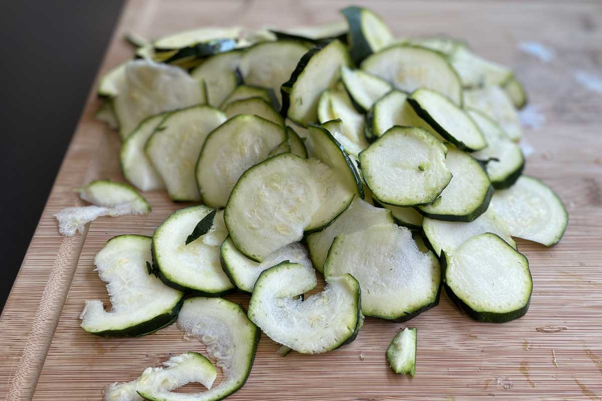 Découpez la courgette en très fines tranches (utilisez une mandoline en faisant attention à vos doigts !). Faites blanchir ces tranches dans de l'eau bouillante salée pendant 2 minutes. Égouttez-les soigneusement et essuyez-les.