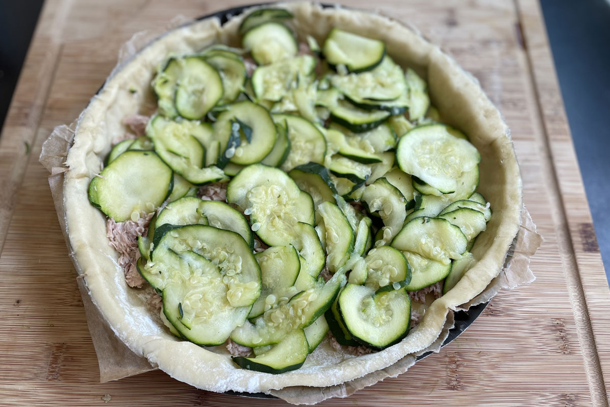 Sortez la pâte du réfrigérateur. Étalez la pâte et garnissez-en le moule. Disposez le thon émietté au fond de la tarte et disposez les courgettes au-dessus.